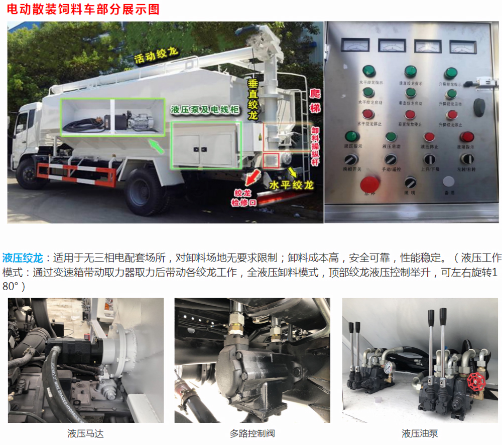 2.絞龍電機均采用國產優質電機,在粉塵、雨林、腐蝕性消毒水、惡劣的行駛環境下,保證散裝飼料車的良好運行。