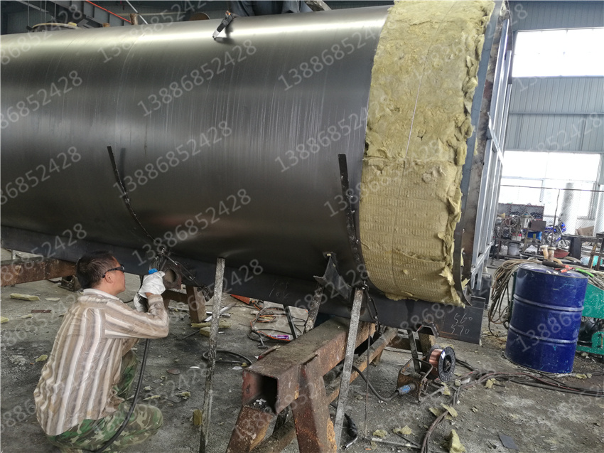 3. 保層溫的制作是在水罐外部另外焊接10mm厚的支撐骨架,然后用保溫材料將骨架內部填充滿,**在骨架外蒙上一層外皮。 保溫層外表鐵皮采用8mm厚高強度耐磨板,可選擇使用不銹鋼分鏡面8K或磨砂板