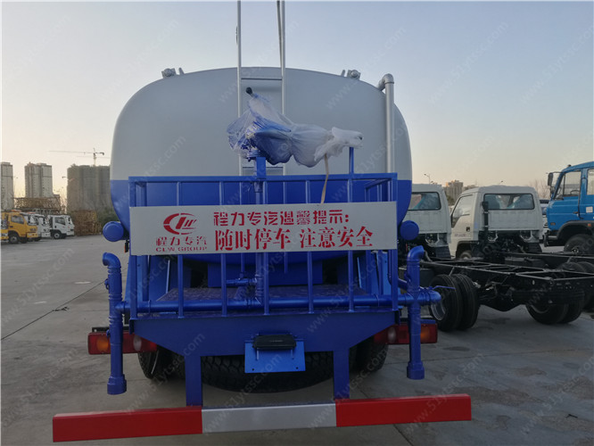 6、灑水車前噴頭位置較低,靠近地面,噴灑壓力較大,可用于沖洗路面;后噴頭位置較高(灑水車后噴頭一般左右各安裝一個),灑水面較寬,可用于公路施工灑水,使用后噴頭時,應將前噴管關閉;使用可調噴頭灑水時,灑水寬度可根據需要調整。灑水寬度越寬,中間重疊量越少,灑水密度越均勻。