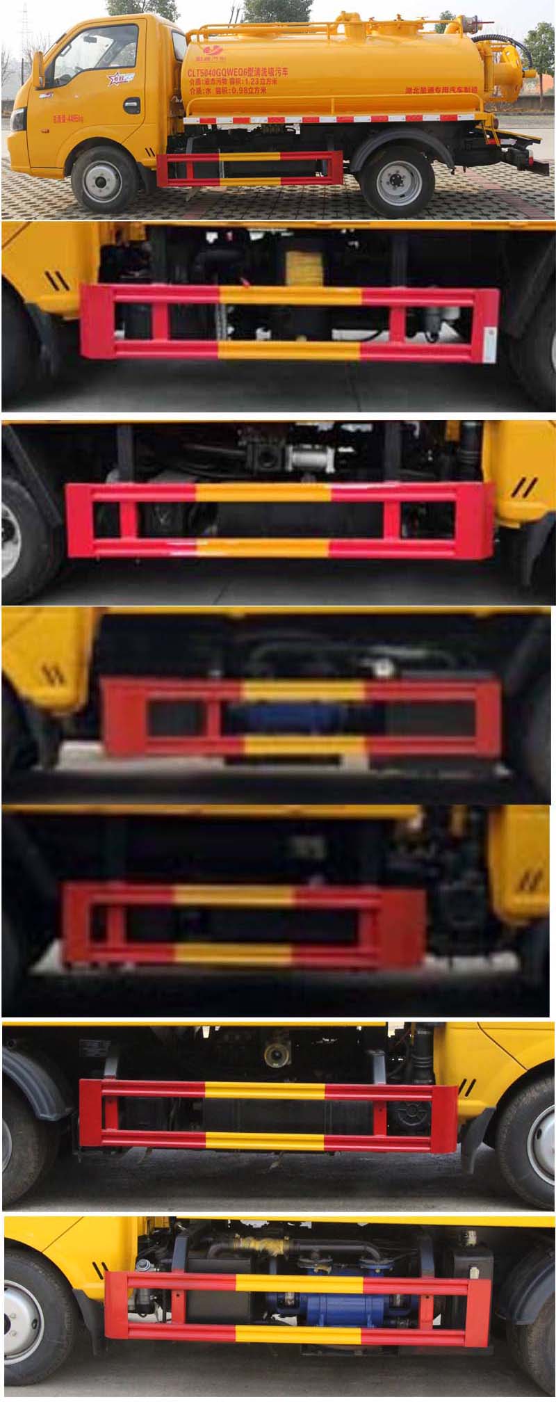 該車用于下水道排污及疏通,專用裝置:罐體及清洗吸污裝置;罐體外形尺寸(長×長軸×短軸)(mm):2800×1550×1000,罐體前段為清水罐(長1590mm,其中前端下部1100mm用于安裝高壓泵);后段為污水罐(長1210mm);污水罐總?cè)萘?/span>:1.29立方米,污水罐有效容積:1.23立方米,介質(zhì):液態(tài)污物,密度800千克/立方米;清水罐總?cè)萘?/span>:1.03立方米,清水罐有效容積:0.98立方米,介質(zhì):水,密度1000千克/立方米,清水罐和污水罐為獨(dú)立罐體,清洗功能時(shí)用清水罐,吸污功能時(shí)用污水罐,污水罐和清水罐不可同時(shí)滿載,兩罐不能同時(shí)滿載使用;ABS型號/廠家:APG3550500A/浙江亞太機(jī)電股份有限公司;側(cè)、后防護(hù)材料均為:Q235碳鋼,連接方式均為:螺栓連接,后部防護(hù)截面尺寸(mm):100×50,后部防護(hù)離地高度(mm):360.僅采用底盤2800mm軸距改裝.選裝油箱及電瓶位置。隨底盤選裝駕駛室。 |