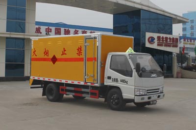 廂體頂部封閉,不可開啟。隨底盤選裝駕駛室。 并選裝側開門。側/后防護裝置材料材質為Q235A碳鋼,側防護與副梁,后防護裝置與車架均采用焊接連接,后防護斷面尺寸(寬贅?50?00(mm),離地高度為440mm.運輸品名:炸藥,雷管,煙花爆竹等,類項號:1.1B,1.1D,1.1G,1.2G,1.3G,1.4G等;安裝帶衛(wèi)星定位功能的行駛記錄儀;配裝限速裝置,最高時速80km/h。僅采用有前盤制動器和安裝ABS的底盤。僅采用子午線輪胎。僅采用排氣管前置的底盤。該車裝有ABS;ABS型號:355080020,生產(chǎn)廠家:浙江亞太機電股份有限公司。僅采用JX493ZLQ4發(fā)動機,油耗值為12.6。
